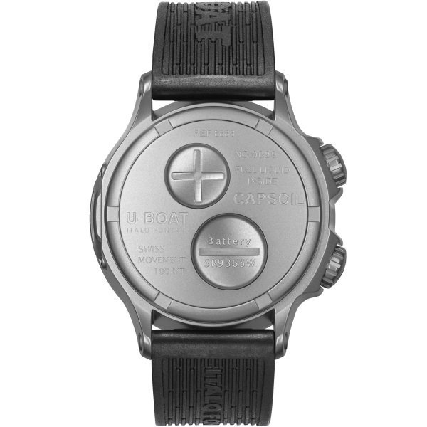 MOVEMENT. swiss electro-mechanical movement lubricated through an oil bath, personalized to U-BOAT specifications. Working between 0 /+60 when not worn.. . FUNCTIONS. Bidirectional inner bezel, references for the second time zone with 30 minute intervals.. . CASE. AISI 316L stainless steel completely filled with a special oil that emphasizes the dial, creating the illusion of the absence of glass, and an optical effect of a more intense black and higher legibility. Visible air bubble on the dial to compensate the temperature variations. Double crown on the left side, one for the time adjustment, the other for the second time setting. 45 mm diameter.. . BACK. innovative locking system (Locking Ring System) with quick battery replacement.. . DIAL. two superimposed layers, with rotating inner bezel. Hands, numbers and indexes treated with superluminova in beige colour, visible tightening screws. Second time zone hand.. . CRYSTAL. high quality curved sapphire.. . WATER RESISTANCE. 100 mt, 10 ATM.. . STRAP. ultra-resistant vulcanised rubber, in black color. Width: 22/20 mm. STRAP: ref. 3001/Z. Tongue buckle in steel. BUCKLE: ref. 5466/SCREWS