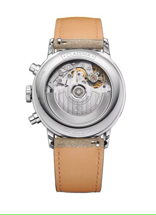 . The Classima 10782 boasts a sophisticated design with a sand-coloured sunburst dial, anthracite accents, and azure sub-dials. Housed in a 42mm polished stainless steel case, this Classima Chronograh features day and date windows, a self-winding movement, a 48-hour power reserve and 5 ATM water resistance. It features an interchangeable sand-colored suede calf leather strap and stainless steel folding clasp.