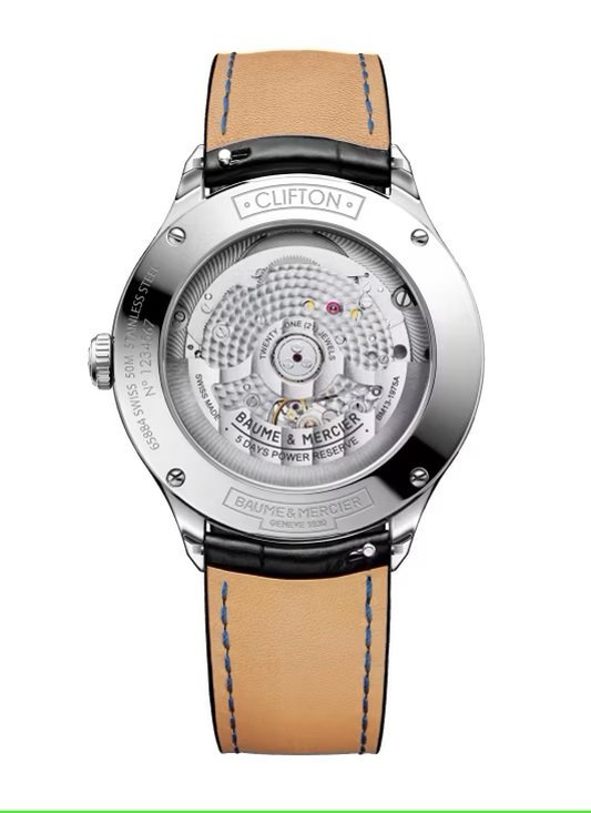 . A sophisticated gentlemans wristwatch, the Clifton Baumatic 10518 is an automatic date watch for men, manufactured with a manufacture self-winding calibre. Its balanced aesthetic pairs a timeless black alligator strap with a white dial, featuring both hour and minute time markers and the iconic date aperture at 3 oclock. The steel case is finished with a transparent sapphire case back, through which the COSC automatic movement can be observed.
