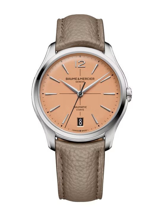 . The Clifton 10778, limited to 350 pieces, has a round case in satin-polished stainless steel and joins the collection in a 39 mm format. The case features a stainless steel crown and an open sapphire case back. The salmon opaline dial, bordered by a black minute track and crosshair, highlights the Arabic numeral at 12 oclock, the rhodium-plated and faceted riveted trapezoid-shaped indexes and the alpha-shaped hands. It is equipped with a self-winding Baumatic movement (BM13-1975A) with a 5-day power reserve and water resistance up to 5 ATM. The interchangeable black calfskin strap and the additional beige calfskin strap feature a reliable tool-free replacement system.