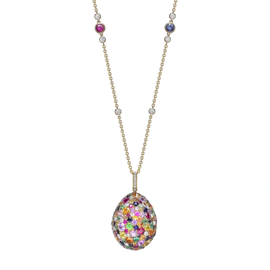 The Emotion Yellow Gold Multicoloured Sapphire, Ruby, Emerald & Tsavorite Egg Pendant comes set in 18 karat yellow gold, with an 18 karat yellow gold gem-set chain. The egg pendant is 26mm.. . The Emotion Collection, infused with intense colour, explores the intellectual and artistic richness of Faberg's world. These bold and daring jewels, pushing the boundaries of design and craftsmanship in true Faberg spirit, explore Bohemian, Impressionist and Fauvist views of vivid colour as an emotional force and an expression of feeling.