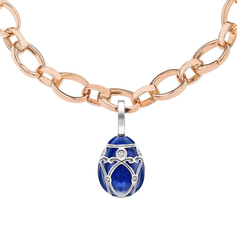 The Heritage Palais White Gold Diamond & Royal Blue Guilloch Enamel Egg Charm features blue guilloche enamel and round white diamonds, set in 18 karat white gold. The charm is 14mm. The Rose Gold Chain Charm Bracelet is sold separately.. . The Heritage collection draws inspiration from Fabergs historical masterpieces. Traditional materials and complex traditional techniques, such as the delicate art of guilloch enamelling and hand-engraving, make up the signature elements of this colourful and opulent collection.