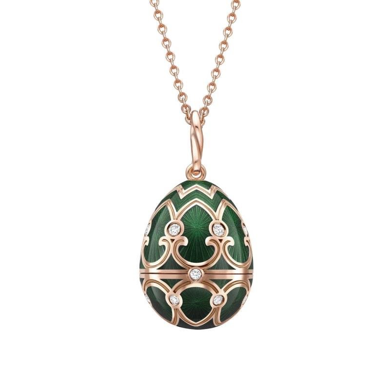 The Heritage Rose Gold Diamond & Green Guilloch Enamel Elephant Surprise Locket is set in 18 karat Rose gold and green vitreous enamel containing 15 diamonds and opens to reveal an Elephant surprise with diamond eyes. The locket is 22mm and comes with a 50cm 18 karat Rose gold chain.. . The Heritage collection draws inspiration from Fabergs historical masterpieces. Traditional materials and complex traditional techniques, such as the delicate art of guilloch enamelling and hand-engraving, make up the signature elements of this colourful and opulent collection.