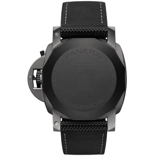 TECHNICAL DETAILS. MOVEMENT. Automatic mechanical, P.9010 calibre, executed entirely by Panerai, 13 lignes, 6.0 mm thick, 31 jewels, Glucydur balance, 28,800 alternations/hour. Incabloc anti-shock device. Power reserve 3 days, two barrels. 200 components.. . FUNCTIONS. Hours, minutes, small seconds, date. . CASE. Diameter 44mm, titanium. . BEZEL. Carbotech. . BACK. Screw, titanium. . DIAL. Anthracite with luminous Arabic numerals and hour markers. Date at 3 o'clock and small seconds at 9 o'clock. . WATER RESISTANCE. "30 bar (~300 metres)". . STRAP. Panerai Sportech Black, Anthracite Stitching, 24.0/22.0 Standard size