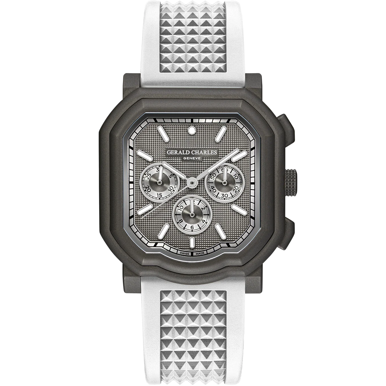 The strap is presented in white vulcanised rubber, featuring a Clous de Paris finish on the top side and the signature Gerald Charles logo tapisserie on the rear, secured with a Darkblast® Grade 5 Titanium pin buckle engraved with the GC logo.