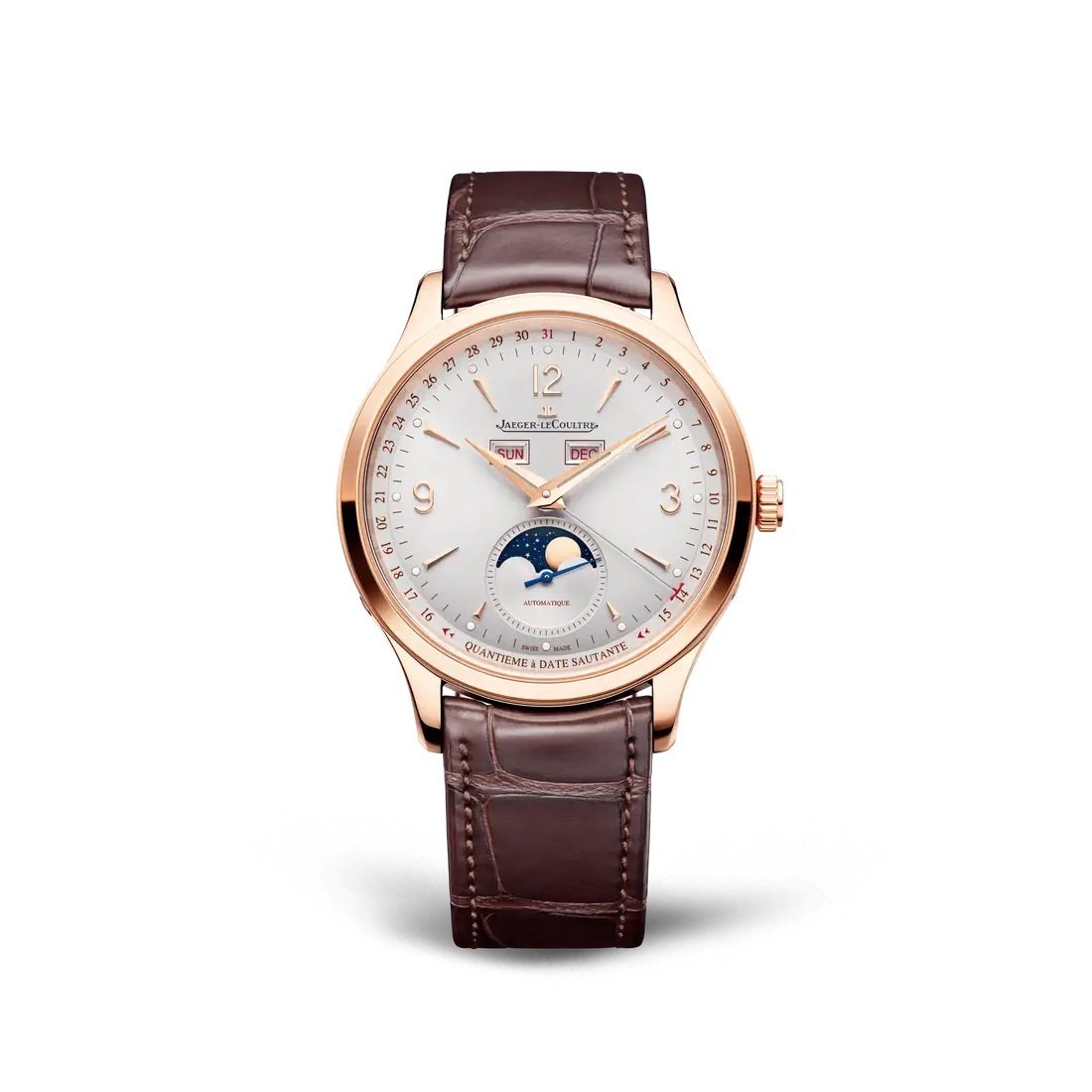 In its 40-mm case in pink gold, the new Master Control Calendar offers its complications their most beautiful role. It gives the time but also the complete calendar, not to mention its ingenious jumping date, finished with a refined red Jaeger-LeCoultre anchor. As its name suggests, this complication allows the date indicator to literally jump between the 15th and the 16th day of the month, ceding place for the moon phase. In an aperture at 6 oclock, the star of the night is revealed or hidden against a background of the starry midnight blue sky.