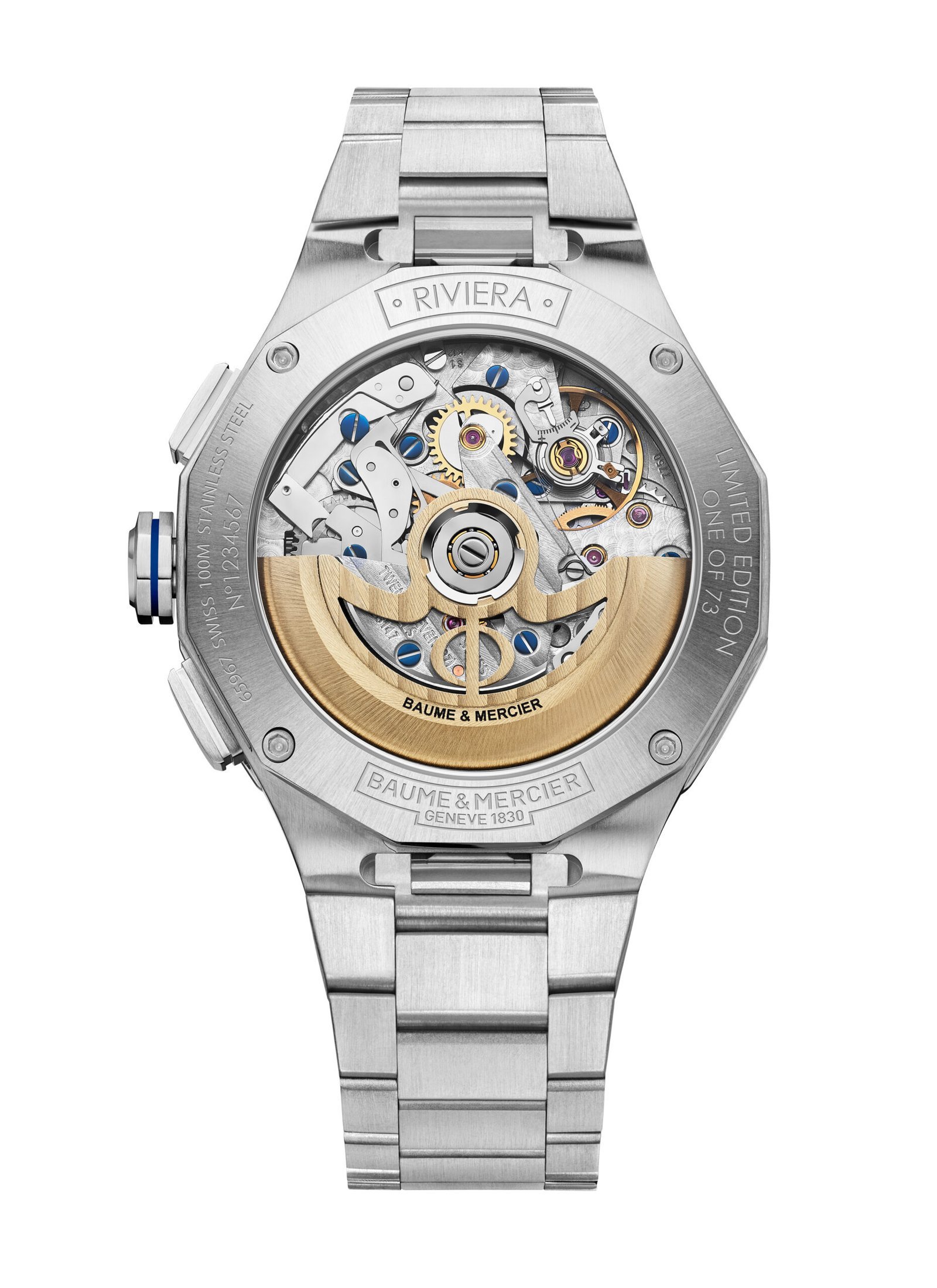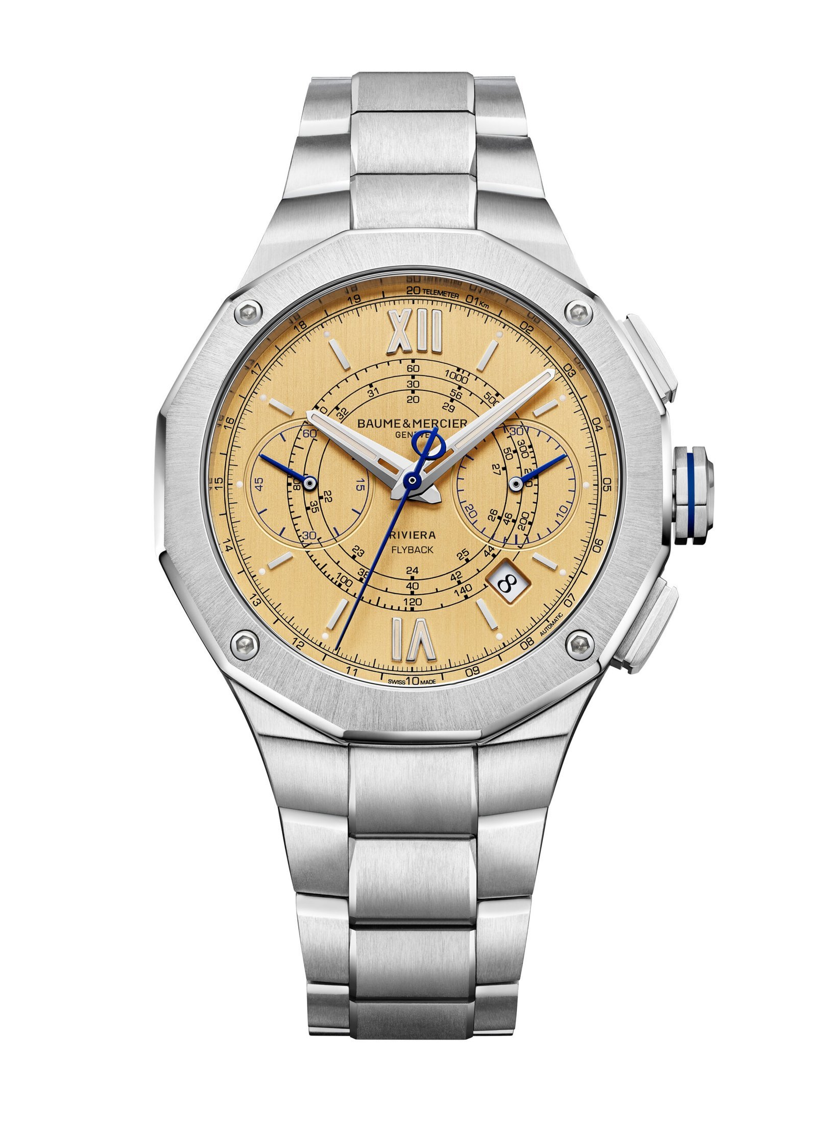 . The Riviera Flyback Chronograph 10828, limited to 73 pieces, celebrates the collection’s launch year, 1973, in a 41 mm format. The dodecagonal case in polished and satin-finished stainless steel, protected by an anti-reflective sapphire crystal, houses a luminous vertical brushed gold dial with a vintage allure. The dial features chronograph, telemeter and tachymeter counters, Roman numerals and rhodium-plated indexes with beige Superluminova. The watch is equipped with a self-winding movement with flyback function, a 42-hour power reserve and water resistance up to 10 ATM. The interchangeable stainless steel bracelet features a reliable tool-free replacement system.